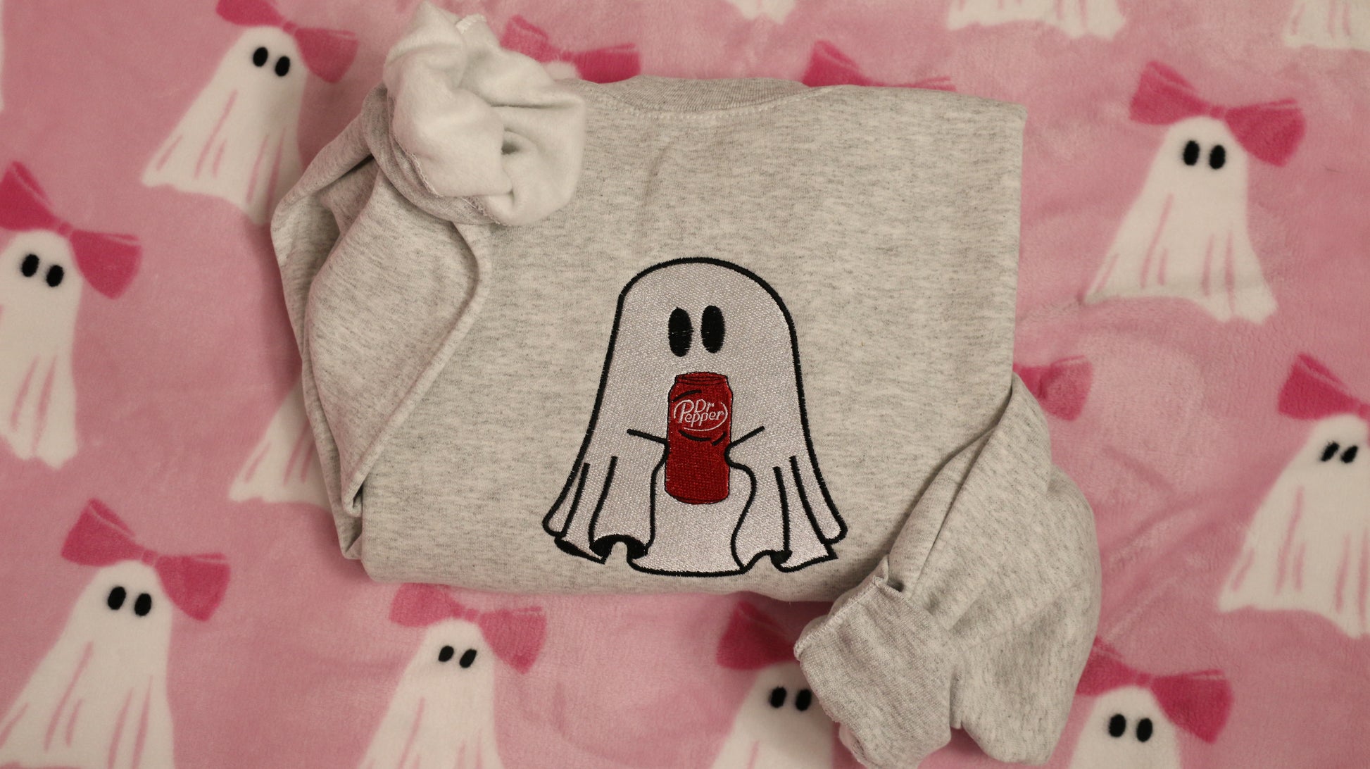 Sip in spooky style! This cozy embroidered sweater features a playful ghost holding a Dr Pepper — perfect for fall vibes, Halloween season, or just showing off your love for your favorite drink. Each piece is made to order with care, making it a unique must-have for your wardrobe.