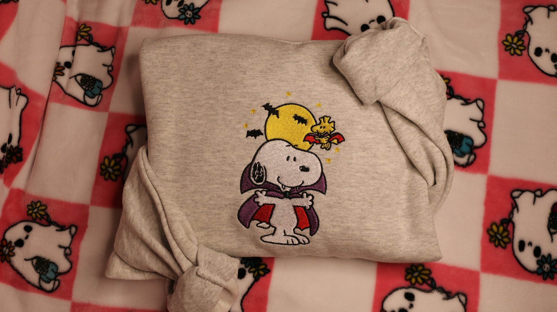 Add some spooky sweetness to your wardrobe with our Vampire Snoopy & Woodstock Moonlight embroidered sweatshirt! This charming design features Snoopy in a purple-lined vampire cape with Woodstock flying above him in his own tiny vampire cape, set against a glowing full moon with bats fluttering by. Perfect for Halloween festivities, pumpkin patch trips, or staying cozy on cool fall evenings.